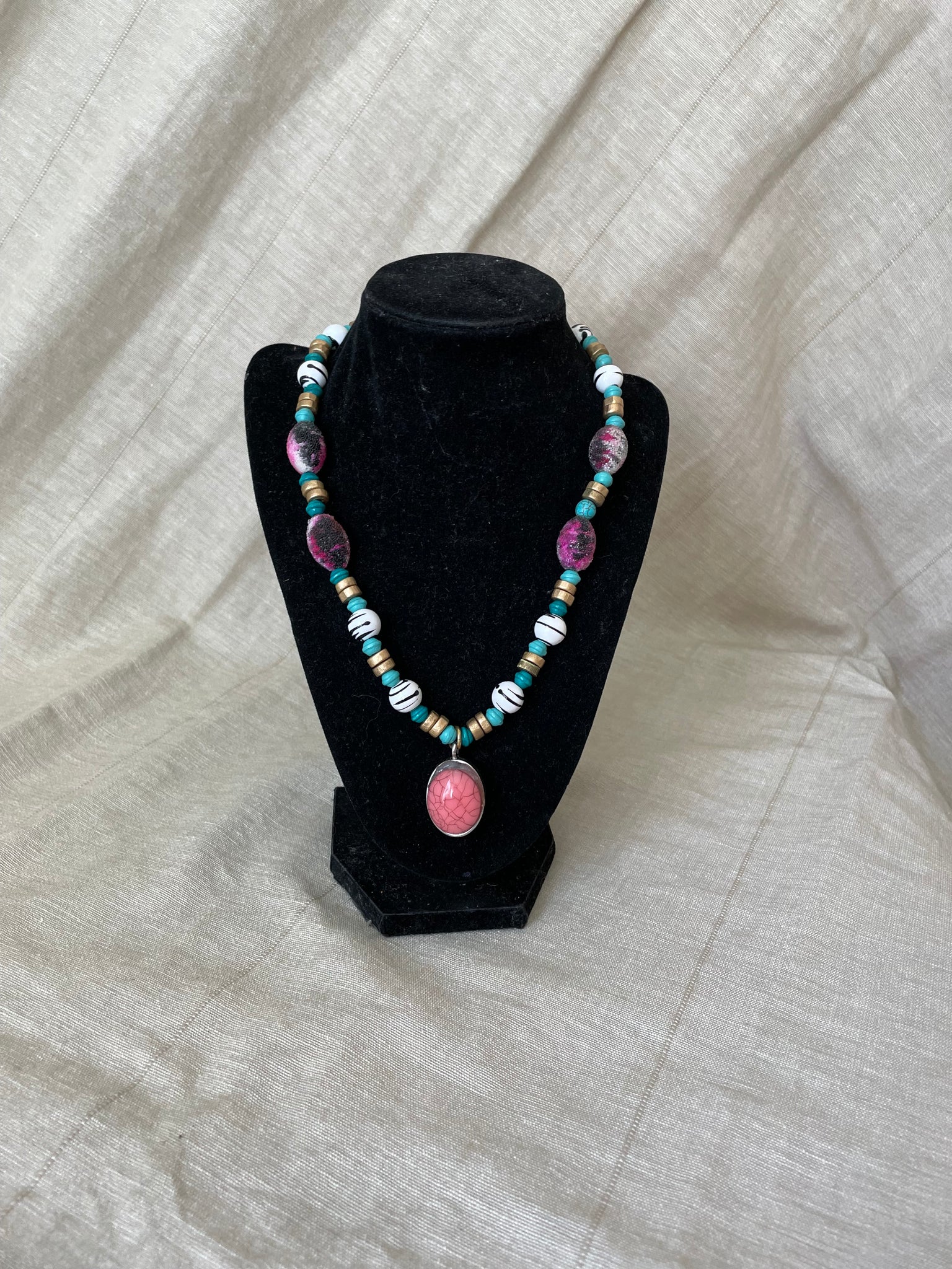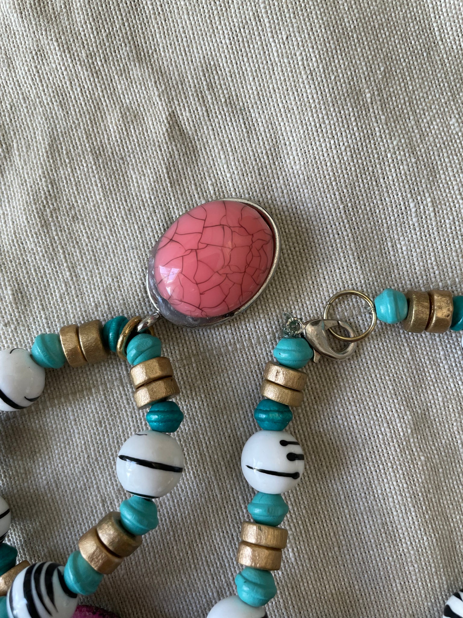 This piece by Felix features a central salmon colored stone with gold and turquoise accent beads. This fun and tropical necklace is 10" in length and is fastened with a lobster clasp.
